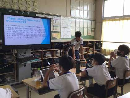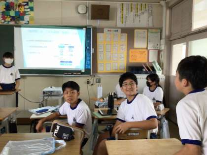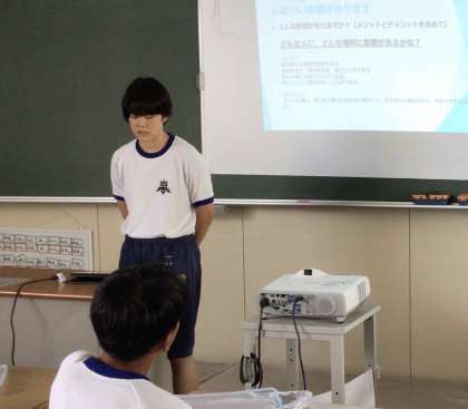 1年生は2クラスあるため、全体で4グループに分けて発表を聞き合いました。2年生で実施する職場体験学習に向けて、様々な職業があることを知る機会となりました。