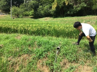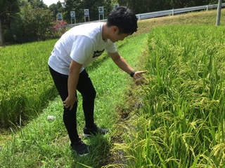 稲作を主に担当している三好教諭と豊田教諭は、敏朗さんの手ほどきを受けながら、こまめに田んぼの様子を確認しています。愛情を注がれた稲は、順調に育っています。