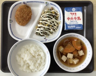 9/18 今日の給食 公開日 2024/09/18 更新日 2024/09/18 各学年から 今日の献立は、ごはん、けんちん汁、骨太サラダ(マヨネーズ風ドレッシング)鰹のミンチカツ、牛乳、でした。エネルギー:834kcal