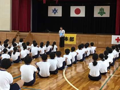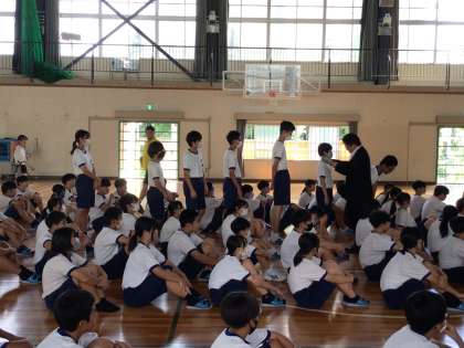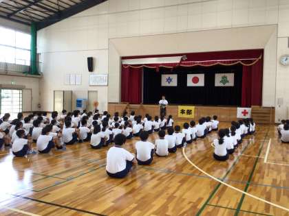 今回は、生徒たちが各々の場所で清掃活動を行っているときに地震が起きたという想定で訓練を行いました。2年生の生徒たちは、緊急放送にしっかり耳を傾け、整然と体育館に避難できていました。