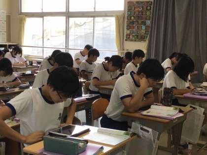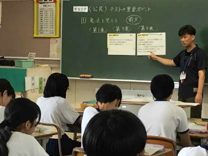 3年生は、明日から始まる期末テストに向けて集中して学習に取り組んでいます。社会科の公民の学習では、日本国憲法で覚えておくべきポイントを押さえ、繰り返し復唱しながら確認していました。