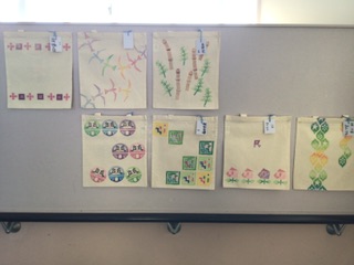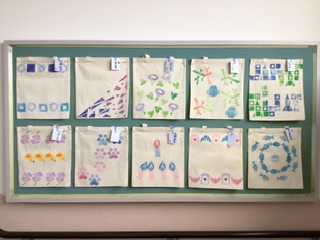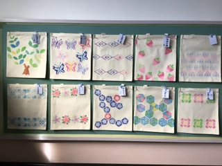 学習した色相環の知識を活かして、美しい色合いのスタンプを押したバックが完成しました。校舎東側階段の掲示板に飾られています。