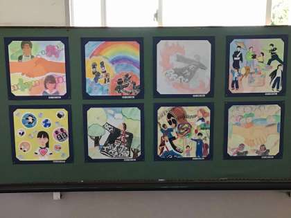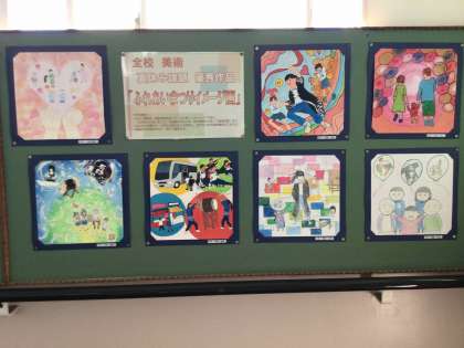 美術の夏休み課題として提出された、ふれあいまつりのイメージ画が、校舎西側階段に掲示されています。ふれあいまつりの温かさ、楽しさが伝わる作品です。