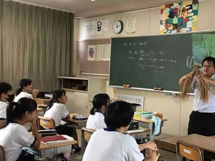 1年生の英語の授業で、17日に迫った稲刈りを題材にした場面がありました。笑顔で説明を聞く生徒の姿がありました。英語を身近に感じさせながら、稲刈りの方法も学ばせる担当教諭の知恵と工夫です。