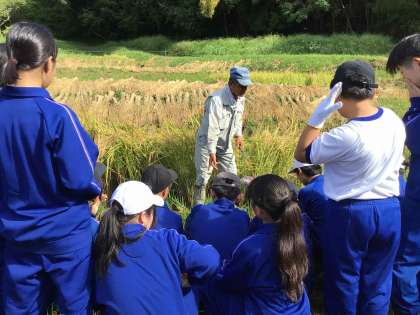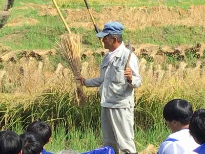 鈴木敏朗さんのお力添えのおかげで、今年度も石農米を収穫することができました。ライサーズのリーダーの進行で始めの会を行い、鎌で稲を刈る方法を教えていただきました。