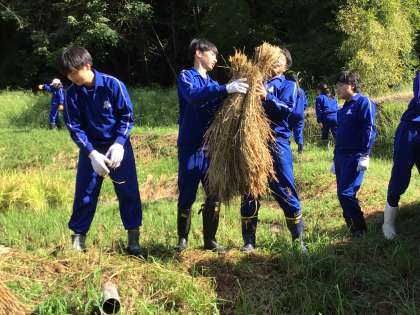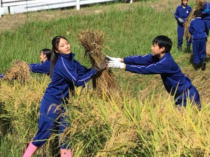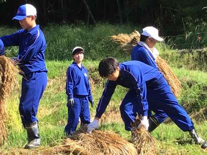 稲刈りにあたり、上切自治区長の加藤様、前々上切区長の永井様が軽トラを出して協力してくださいました。生徒が手渡しで軽トラに稲を積み込んだ後、校舎まで運んでくださいました。作業がとてもスムーズに進み、大変ありがたかったです。