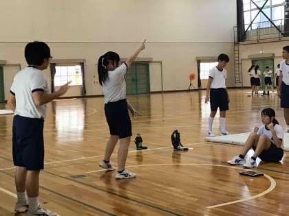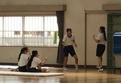 3年生の体育では、マットでダンスのグループ発表に向けて、アイディアを出しながら技の練習をしています。どのグループも楽しそうに練習しています。