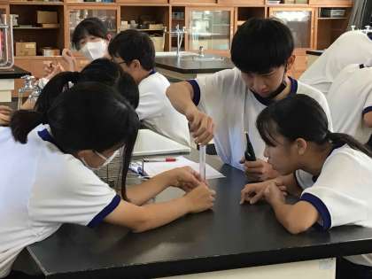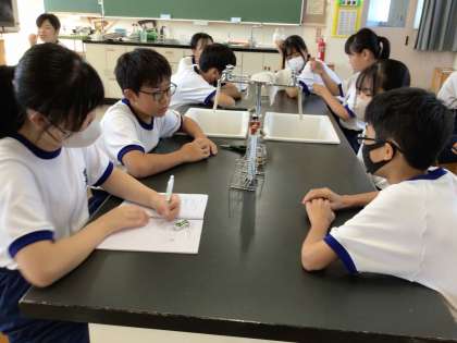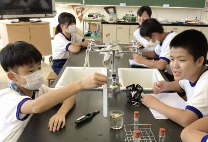 1年生の理科では、試験管に気体を集め、火を近づけたり、石灰水を入れたりしたときの反応を観察しました。驚きや発見がある実験は、生徒の目が輝いています。