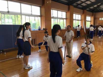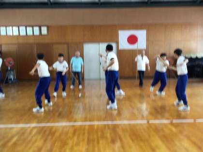 汗を流しながら、練習に励んでいた棒の手のグループです。講師の助言を受け、互いにアドバイスしながら演舞に磨きをかけています。