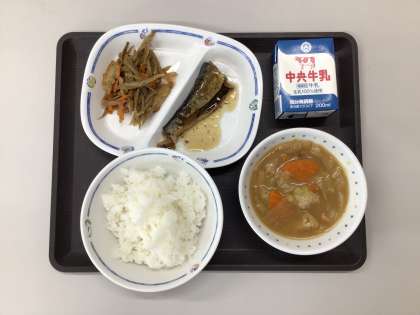 今日の献立は、ごはん、ちゃんこ汁、きんぴらゴボウ、鰯のショウガ煮、牛乳、でした。エネルギー:820kcal
