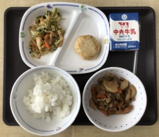 今日の献立は、ごはん、根菜の煮物、アーモンドあえ、豆腐しんじょ、牛乳、でした。エネルギー:793kcal