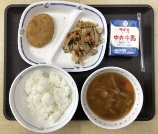 今日の献立は、ごはん、サツマイモの味噌汁、キノコごはん、鰹のミンチカツ、牛乳、でした。エネルギー:835kcal