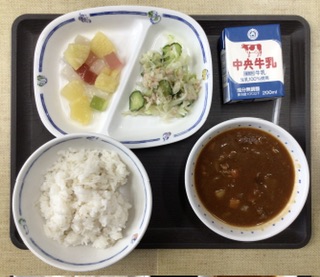 今日の献立は、麦ごはん、ハヤシライス、ツナサラダ、ナタデココポンチ、牛乳、でした。エネルギー:852kcal