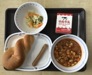 10/17 今日の給食 公開日 2024/10/17 更新日 2024/10/17 各学年から 今日の献立は、ツイストパン、ポークビーンズ、サワーキャベツ、ウインナー、牛乳、でした。エネルギー:828kcal