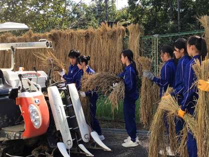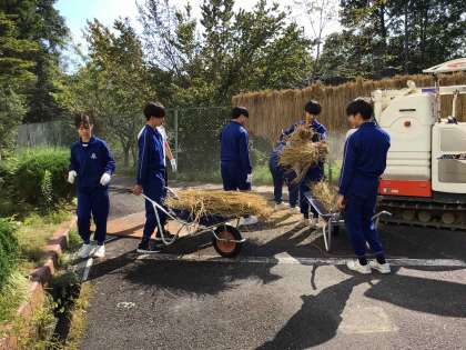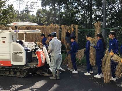 鈴木敏朗さんの協力のもと、天日で乾かした石農米を3年生が脱穀しました。手際よく作業を進められる3年生はさすがです。