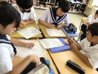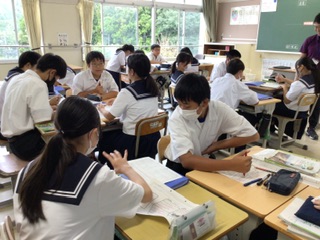 どの学級でも、生徒が自分の考えをもち、言語活動を通して理解を深めたり考えを広げたりすることができるように、グループでの話し合いや全体の前での発表などを設けています。
