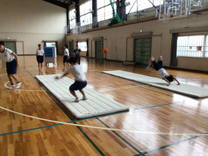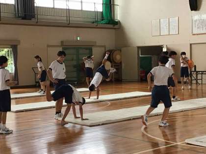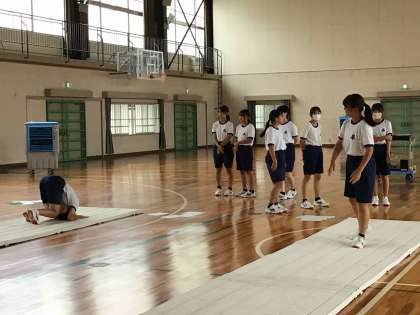 2年生は体育のマット運動で連続技に挑戦しています。それぞれが自分の力に合わせて技を選択し、練習に取り組んでいます。