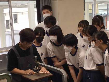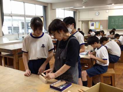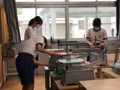 2年生の美術では、木材を使って「やさしいバターナイフ」を制作しています。アイデアスケッチが完成した生徒から電動糸のこぎりを使って形を切り出しました。