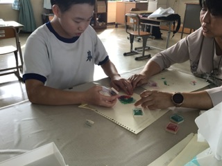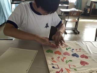 色の美しさを考えながら、自分の好きなスタンプに色をつけてバッグに丁寧に押していきました。完成したバッグに入れたいものを決め、実際に使うのを楽しみにしています。