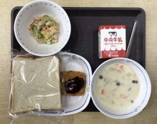 今日の献立は、スライスパン、きのこのクリーム煮、ビーンズサラダ、フィッシュサンド、中濃ソース(サンド用)、牛乳、でした。エネルギー:858kcal