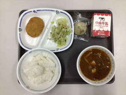 今日の献立は、「あいち県民の日献立」で、とよたひまわりポークの赤だし、青菜和え、豊田市産ジャガイモコロッケ、オニまんじゅう、牛乳、でした。エネルギー:902kcal