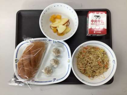 今日の献立は、米粉パン、炒めビーフン、リンゴポンチ、焼売、牛乳、でした。エネルギー:801kcal