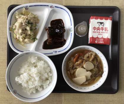 11/25 今日の給食 公開日 2024/11/25 更新日 2024/11/25 各学年から 今日の献立は、ごはん、のっぺい汁、和風サラダ(和風ドレッシング)鯖の味噌煮、梨ゼリー、牛乳、でした。エネルギー:801kcal
