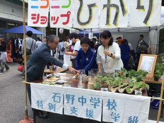 石野中学校の生徒も、3.4組の生徒が手作りした小物を販売したり、粘土でのミニチュアパン作り体験を企画運営したりしました。どちらも好評で用意したものは全て完売しました。