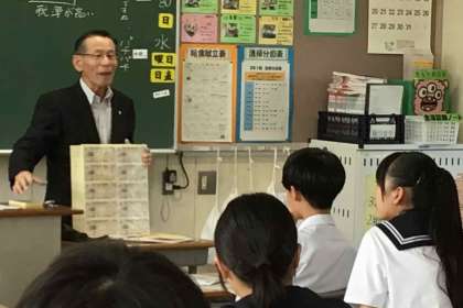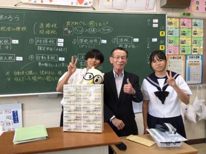 3年生の社会科の学習の一環として、税理士の梅村様にお力添えいただき、租税教室を開催しました。税金の種類や、税率、選挙との関わりなど、生活にかかわる大切な学びの時間となりました。また、1万円札で1億円は10キログラムになることを体感させていただきました。