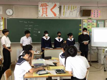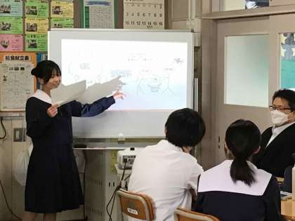 3年生の英語科の授業では、ガンディーについて説明された英文を読み取り、功績等をまとめてグループで発表しました。塩の行進の背景や、非暴力を訴えたガンディーの歩みをイラスト等を使いながら英語で説明しました。