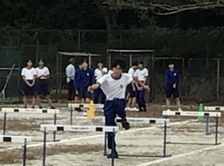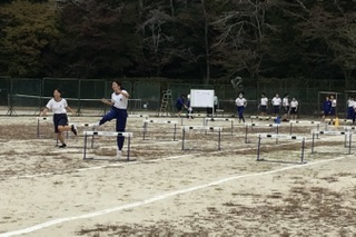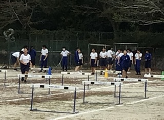 2年生体育科の陸上運動の学習では、ハードル走に取り組んでいます。歩幅を調整してリズムよくハードルを跳んでいくのは難しく、生徒は踏み切る足を変えたり、ハードルの間隔を変えてみたりと工夫していました。