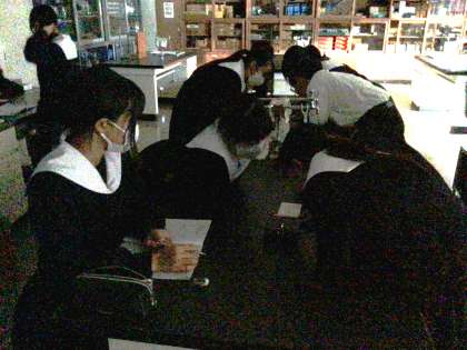 1年生の理科では、光の屈折について実験を通して学習しました。暗くした理科室で、額を寄せ合いながら観察をしている生徒の姿がありました。