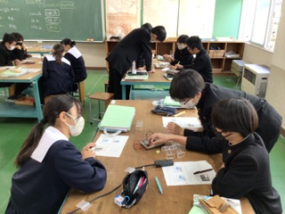 2年生の技術では、抵抗を測定するテスターの使い方を学びました。全員が必ず操作できるようん、お互いに操作の様子を見合いながら練習しました。