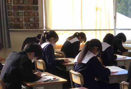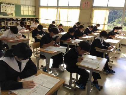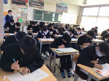 18日(月)の朝、あいさつの坂道を登ってくる生徒の中には、眠たそうな表情の子もいました。休日をはさんだテスト期間、きっと目標をもって頑張ったのだと思います。どの学年の教室も、集中してテストに向かう生徒の姿がありました。