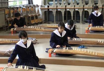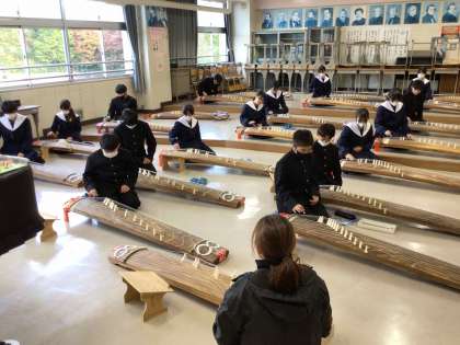音楽の授業では、箏に触れながら日本の伝統音楽のよさにふれています。1年生は、正しく演奏できているかが気になるようで、友達や担当教諭に「これでいいですか」「見てください」と繰り返し確認していました。