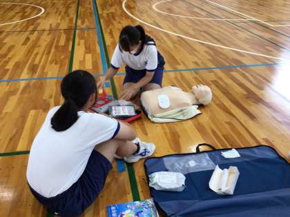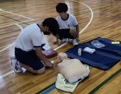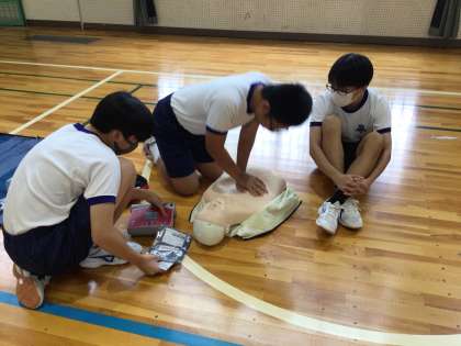 2年生は、保健体育の授業で救命方法を具体的に学びました。心臓マッサージの仕方やAEDの使い方を実際に体験しました。いざという時に動くことは難しいですが、知っておくこと、体験しておくことは貴重な学びになります。
