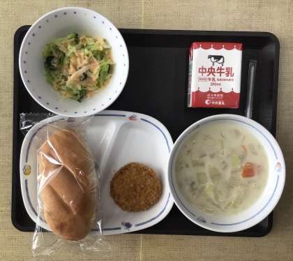 今日の献立は、米粉パン、カブと白菜のクリームスープ、ブロッコリーサラダ(サウザンアイランドドレッシング)、ミンチカツ、牛乳、でした。エネルギー:839kcal