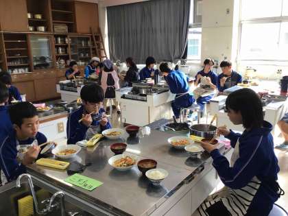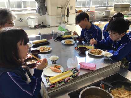 ちょっと固めのごはんが炊けて、おいしそうな豚汁と鮭のちゃんちゃん焼きをおかずに収穫に感謝して会食をしています。