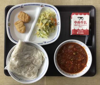 12/10 今日の給食 公開日 2024/12/10 更新日 2024/12/10 各学年から 今日の献立は、ソフト麺、ミートソースかけ、フレンチサラダ、チキンナゲット、コーヒー牛乳の素、牛乳、でした。エネルギー:867kcal