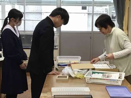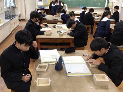 3年生の美術では、卒業制作が始まっています。今までに学んだ技法を生かしてオルゴールの蓋のデザインを考え、担当教諭に相談しながら丁寧に作業を進めていました。