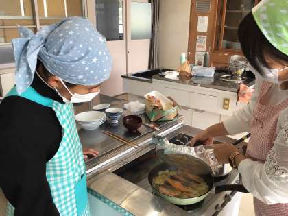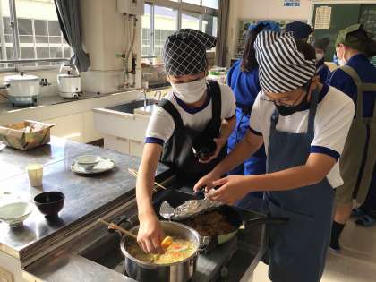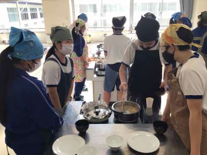 1年2組も順調に調理が進み、お味噌汁の香りが廊下にまで広がっています。「ちゃんと火が通っているかな」「味噌の濃さはちょうどいいかな」と出来上がりを楽しみに鍋の様子を見ている生徒たちです。
