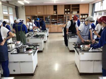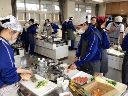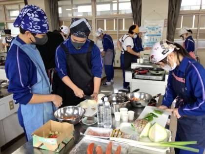 豚汁に入れる野菜を切ったり、鮭のちゃんちゃん焼の下準備をしたりしています。