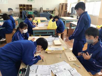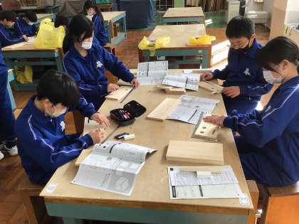 1年生の技術科の学習では、木材加工の学習をしています。のこぎりで切る位置を確認して線をまっすぐ引いています。ボックスが完成できるように、丁寧に作業を進めています。