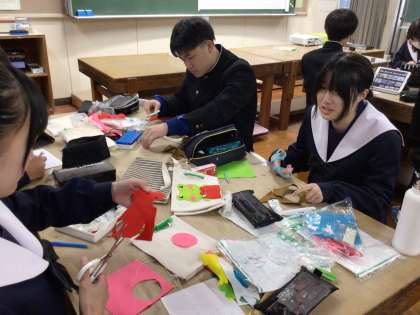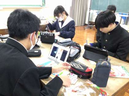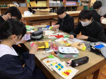 3年生の家庭科で制作している幼児向けの布絵本が完成に近づいてきています。スナップボタンのつけ方などは、教科書のQRコードを読み取って動画で確認しながら作業を進めていました。