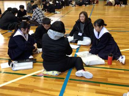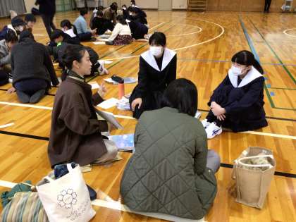 市民活躍支援課の協力の下、1年生は市内の大人との対話プログラムを実施しました。最初は、前回準備したカードをもとに自己紹介をしました。