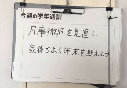 個別懇談会が終わり、あと2週間余りで冬休みを迎えます。気持ちよく年末を迎えるために、各学年ではもう一度基本に立ち返ろうと気を引き締めています。「凡事徹底」「自他尊重」ができているか、足元を見直しながら毎日を大切に過ごせるようにしています。