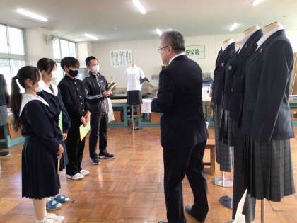ジェンダーレスの観点や快適さ等の理由から、制服を令和8年度からブレザー型に変更していく予定です。12月12日の授業後、制服について業者から説明を聞く時間を設けました。着用する生徒の声を大切にするために、代表の生徒にも参加してもらい、実際に着用したり意見を聞いたりしました。「動きやすい」「こっちのがいいなあ」等、新しい制服を着る未来の石中生のことを考えて感想を伝えてくれました。