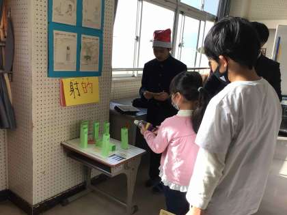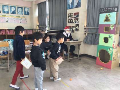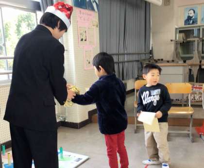 交流会では、3・4組の生徒が準備したゲームを小学生が楽しんでいました。小学生の時に担任された先生から、「中学生の成長を感じてうれしく思いました」という言葉をいただきました。用意した手作りのプレゼントも渡すことができ、小学生に喜んでもらうことができました。