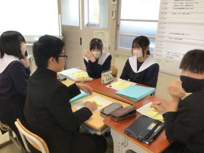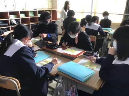 「素晴らしい大人になるために大切なこと」をキーワードとし、そのキーワードに関わる事柄を文章にしていきました。感心したのは、生徒たちの文章力。グループで協力しながら、すらすら文章を書いていました。完成した文章は、一人一人のセリフとして、グループの誓いで述べることになります。