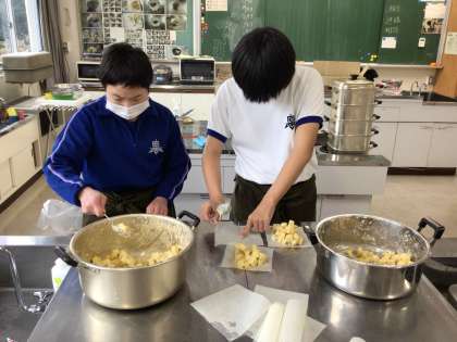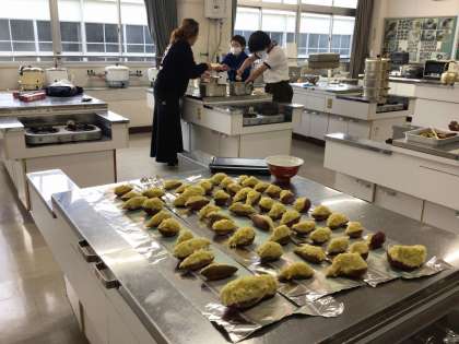 収穫したサツマイモを使って、スイートポテトと鬼まんじゅうをたくさん作りました。教職員に販売する学習を通し、接客の仕方や消費税を含めたお金の計算を学ぶ機会にしています。